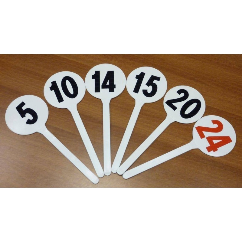 Totale 7 palette: 5 piccole numerate da 1 a 5 + 2 grandi di colore rosso con base di appoggio in acciaio.