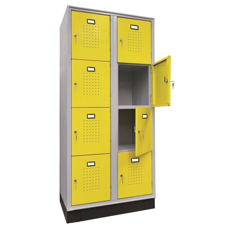 Armadietto spogliatoio Casellario a 8 vani sovrapposti con Nuovo Design arrotondato e completo di zoccolo in Polipropilene antipolvere.