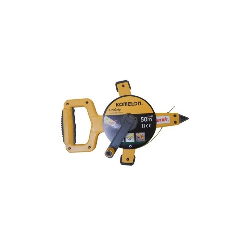 Rotella metrica in acciaio da 50 mt , nastro in acciaio centimetrato, smaltato, impugnatura in plastica resistente e manovella per riavvolgere il nastro