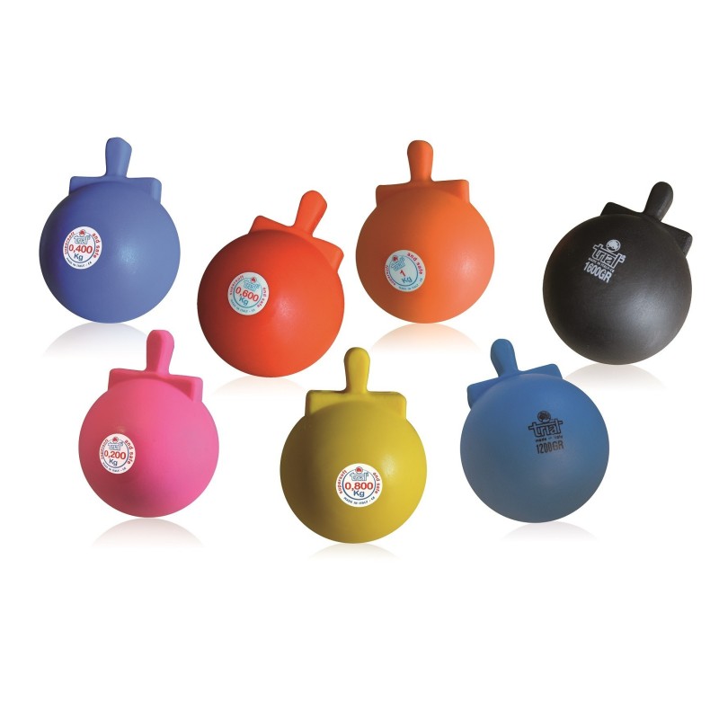 Palla propedeutica per allenamento al lancio del giavellotto di bambini e giovani. La sua conformazione con poresa a T, agevola il lancio favorendo l’asse spalla-braccio-avambraccio-polso-mano facendo risultare il movimento più facile e veloce.