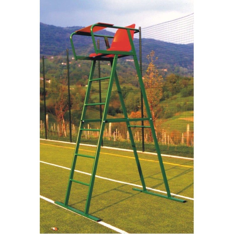 Seggiolone per arbitro tennis, struttura in tubolare di acciaio verniciato con pioli rotondi, completo di leggio in resina melaminica, sedia anatomica in plastica, ampia base di appoggio per renderlo stabile.