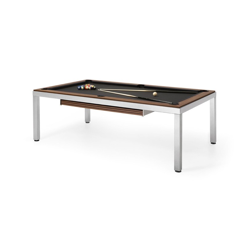 Biliardo FAS (pool americano) di Design modello CUBISTA L'originale e innovativa "carambola che arreda", caratterizzata da un mobile che diventa velocemente un grande e comodo tavolo da pranzo grazie a due coperture in legno coordinate, senza rinunciare alla qualità e robustezza di un biliardo professionale;