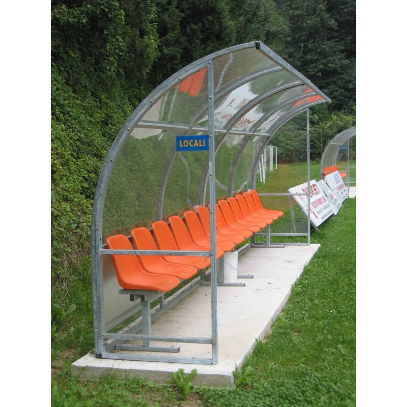 Panchina Calcio mt. 5 modello "Standard" con struttura curva in ACCIAIO ricoperta in policarbonato ALVEOLARE semitrasparente. Per allenatore e riserve.