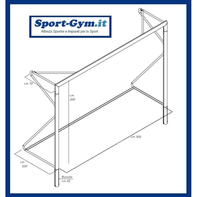 Porta SINGOLA da calcetto mt. 3x2 in acciaio sez. mm 80 verniciate a fuoco, smontabili, da fissare a terra tramite l'inserimento in speciali bussole (in dotazione) precedentemente da cementare nel terreno.