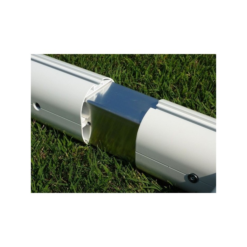 Traversa divisa a metà per agevolare il trasporto. I gomiti sono saldati e rendono la porta ancora più stabile e robusta e le giunzioni sono in alluminio ad alto spessore. Frontoni reggirete in acciaio tropicalizzato.