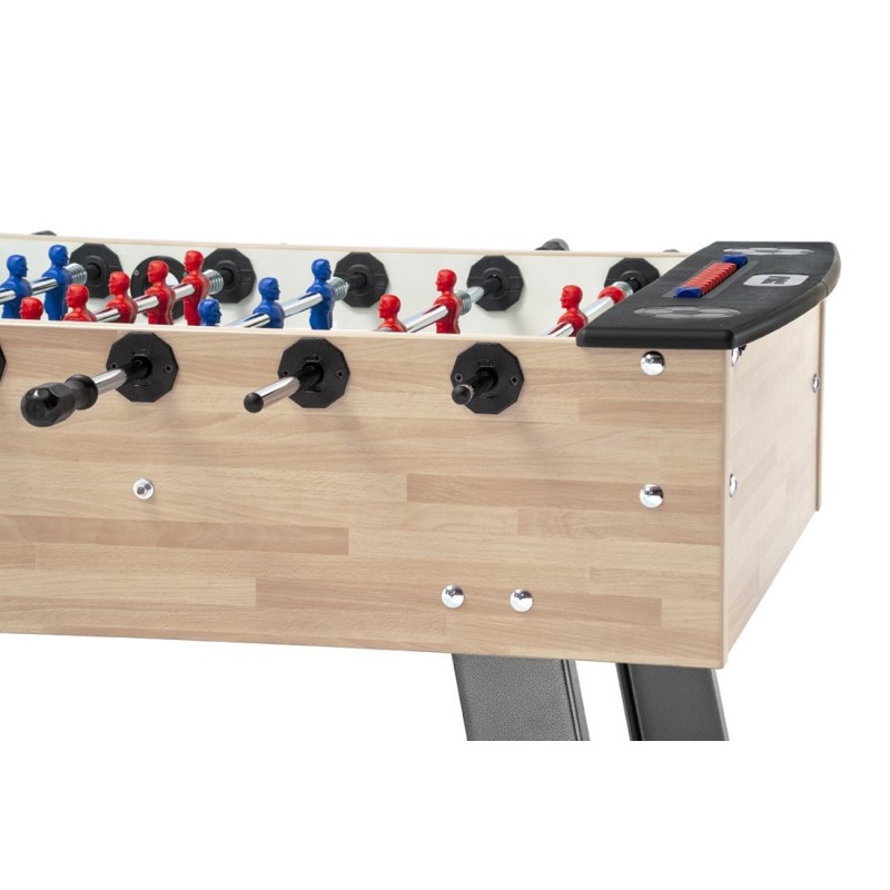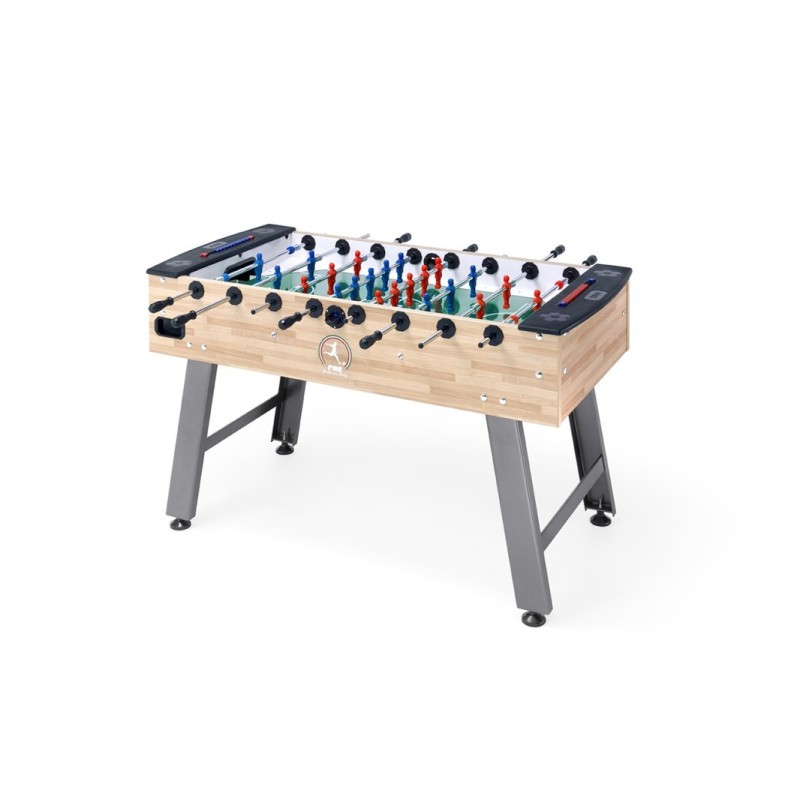 Calciobalilla senza gettoniera moderno in laminato listellare tinta faggio, ideale da casa per famiglie, per parrocchie, centri ricreativi e centri sportivi.