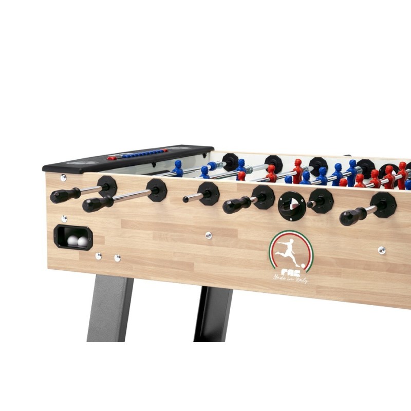 Bellissimo calciobalilla FAS mod. CLUB realizzato in laminato listellare tinta faggio, sponda di 27 mm, foro introduzione pallina, piedini regolabili per conferire un livellamento perfetto del piano gioco e boccole con cuscinetto fisso.