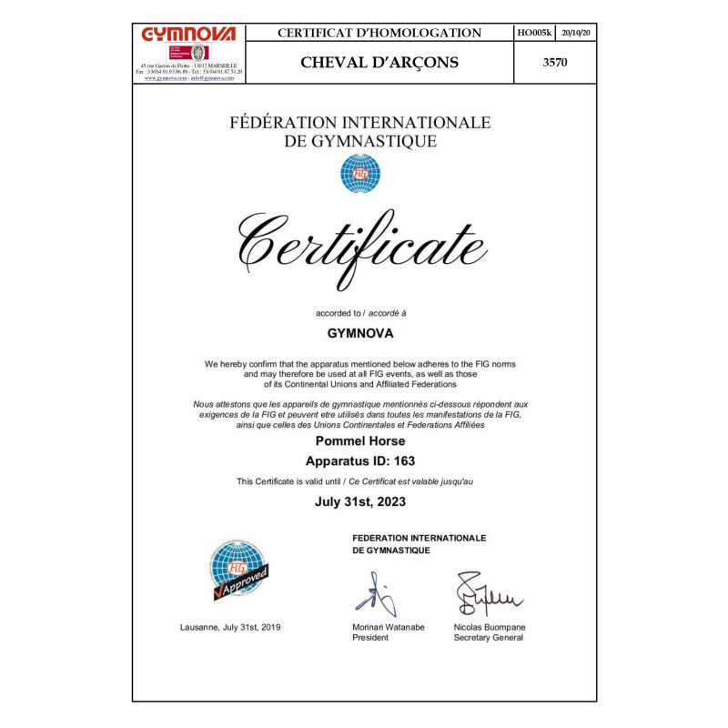 Attrezzo con certificato di omologazione rilasciato da Federazione Internazionale di Ginnastica - F.I.G. che ne permette l'utilizzo in competizioni internazionali e di serie A.