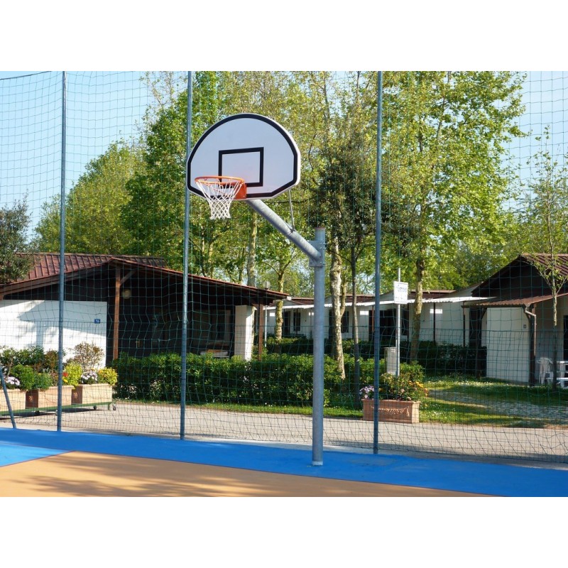 L'impianto dispone di palo rotondo antinfortunistico e della possibilità di abbassare manualmente il tabellone da altezza basket a minibasket. In dotazione canestro zincato a caldo.