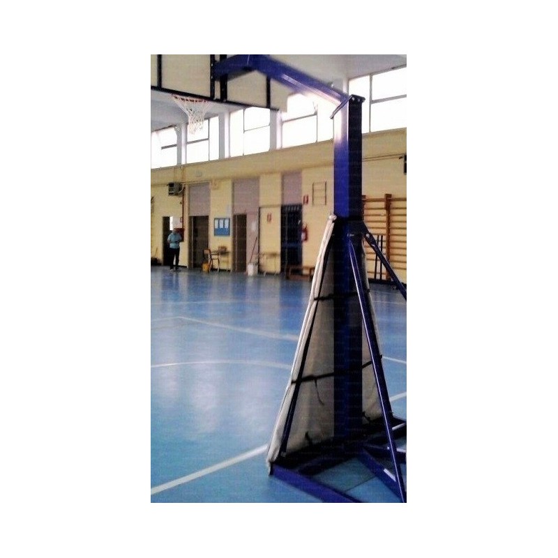 Impianto singolo (1 struttura) da Pallacanestro a traliccio da interno in acciaio zincato trasportabili. Con cassoni portazavorra in lamiera di acciaio zincata predisposti per il fissaggio alla base dell'impianto. Dispositivo di trasporto a leva con ruote gommate. Sbalzo cm 220