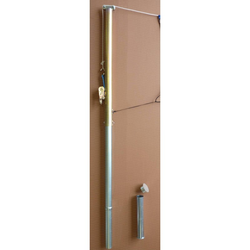 Impianto pallavolo monotubo in acciaio zincato diam. mm 100 con bussole per il fissaggio a terra. Facile regolazione dell'altezza della rete a partire da terra. Completo di arganetto tendirere. Certificato UNI EN 1271
