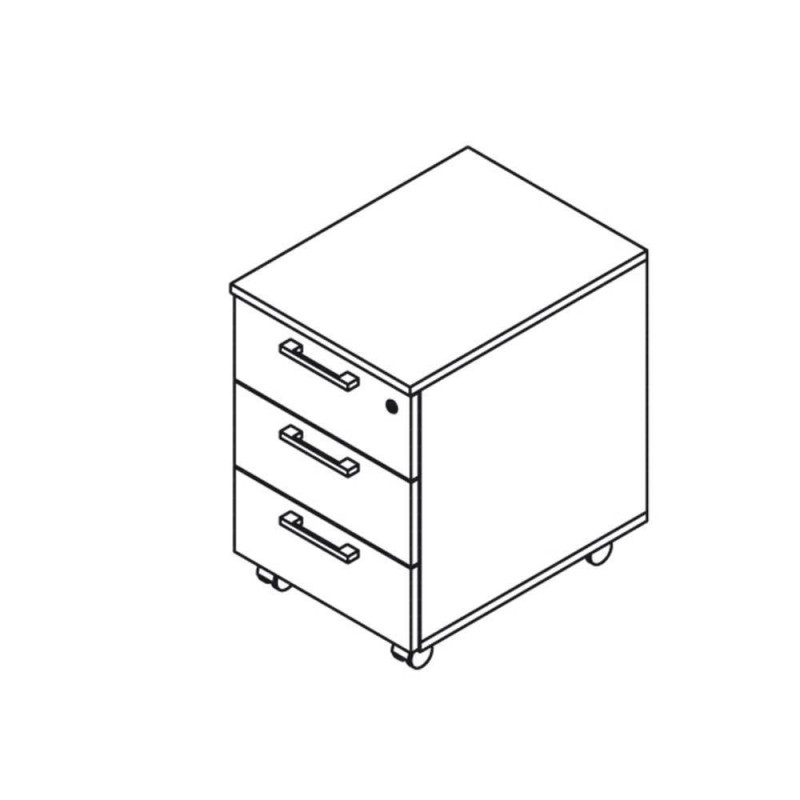 Cassettiera a 3 cassetti con ruote in legno truciolare di spessore mm 18 rivestiti in carta melaminica classe E1 con bordi perimetrali in abs di spessore mm 1. Ruote piroettanti con freno, cassetti a scorrimento su guide di metallo con chiusura centralizzata. Dimensione cassettiera cm 41,5x55x60. Colore grigio chiaro.