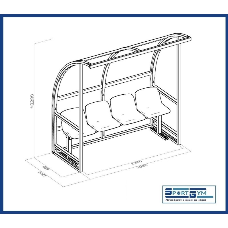 Panchina Calcetto modello "Light" da mt. 2 per staff tecnico e riserve con struttura e fianchi realizzati in ALLUMINIO 40x20 mm. La copertura è in policarbonato ALVEOLARE semitrasparente spessore 4 mm. Posti a sedere 4.