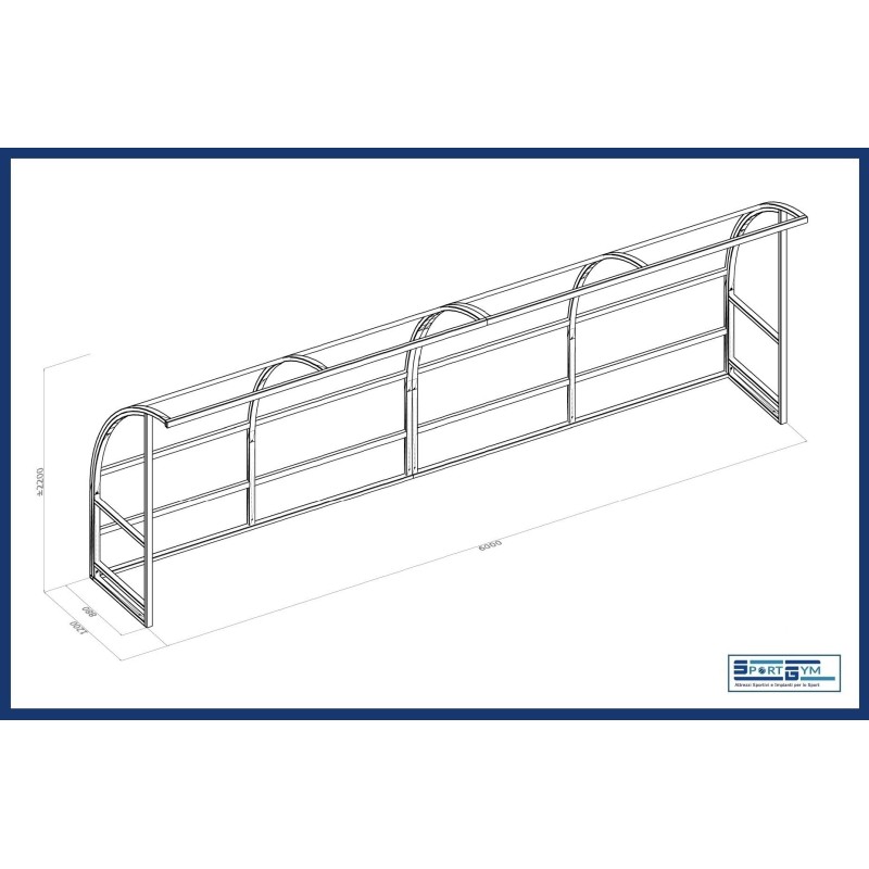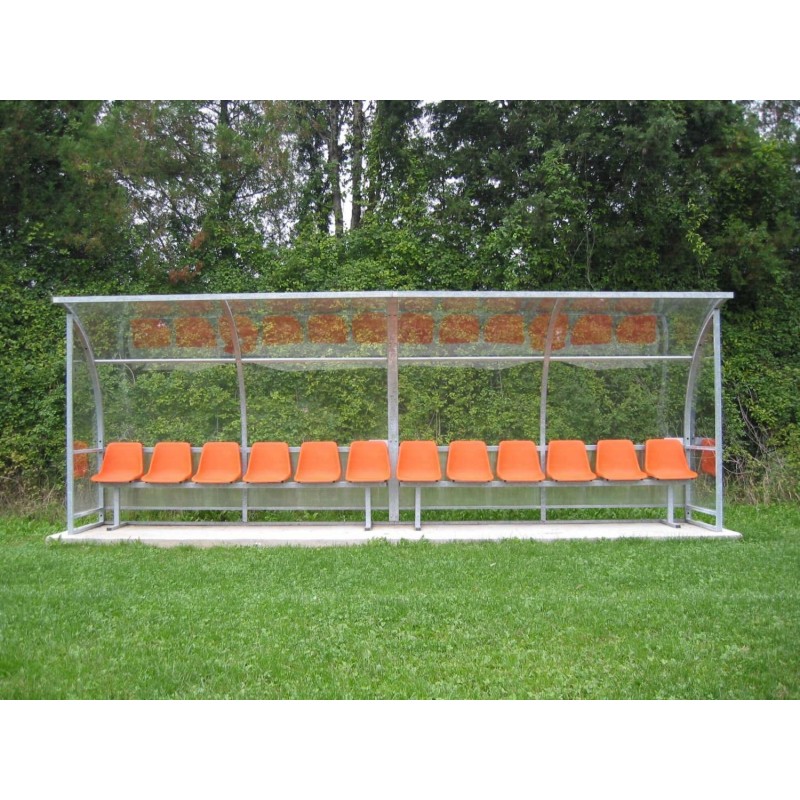Panchina Calcio e Calcetto Mt. 10 con struttura curva Large (prof. curva cm 180) in ACCIAIO e copertura in policarbonato trasparente antiurto, per allenatore e riserve.