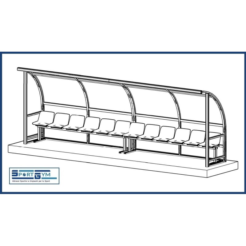 Panchina Calcio e Calcetto Mt. 10 con struttura curva Large (prof. curva cm 180) in ACCIAIO e copertura in policarbonato trasparente antiurto, per allenatore e riserve.