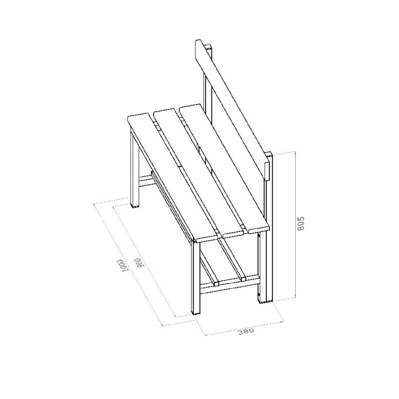 Panchina per spogliatoio mt. 1, con seduta a tre doghe di legno verniciate al naturale e schienale, realizzata in ACCIAIO verniciato a sez. quadra mm 30x30. Dotata di ripiano portascarpe.