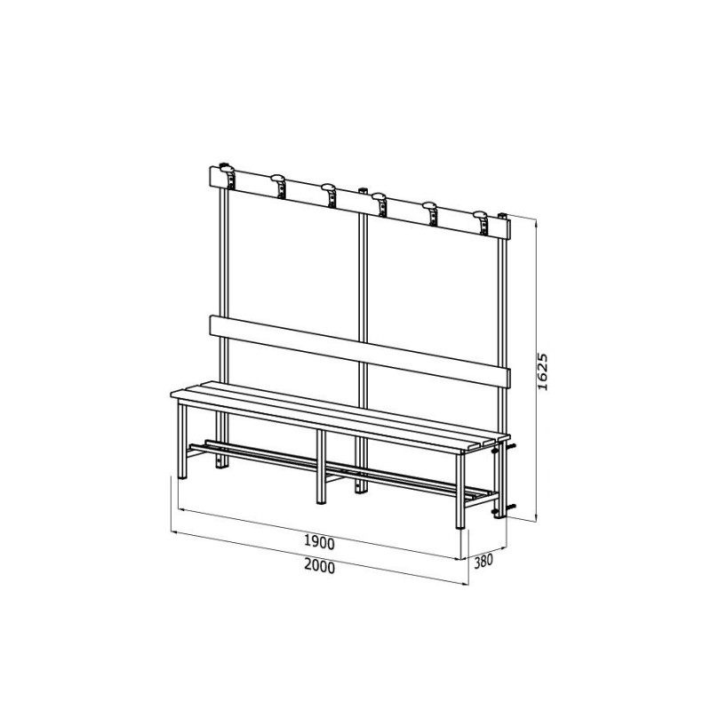 Panchina per spogliatoio mt. 2 in ALLUMINIO anodizzato a sez. quadra mm 30x30 con seduta schienale e appendiabiti in laminato HPL. Dotata di ripiano portascarpe.